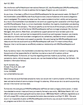 As you know, it has been a difficult time at HIN/PlanetHospital for the past several weeks. On March 4th, the shareholders asked CEO/Founder Rudy Rupak to take a leave of absence while several allegations were investigated. This process has taken over four weeks to determine their validity and seriousness. As a result, the shareholders have decided to not continue supporting their association with Rudy Rupak and HIN/PlanetHospital. Rudy is a minor shareholder; therefore, the majority shareholders are deciding how to wind down the company. The actual specifics as to the future of the company and Rudy are still being negotiated, but all of the former HIN/PlanetHospital staff are no longer employed. We, the Case Managers, Kelly Jenkins, Peter Elson, and additional support personnel have not been paid since February 15. As such, we have had no responsibility to continue working cases; however, we sincerely care about our clients that have been wronged and we, collectively, decided to remain available to provide as much information and support as possible. We were hoping that HIN/PlanetHospital could rebound and that we could continue as HIN/PlanetHospital staff, even if it meant without Rudy. However, that is not the case so we officially ended our relationship with HIN/PlanetHospital as of 4/1/11.